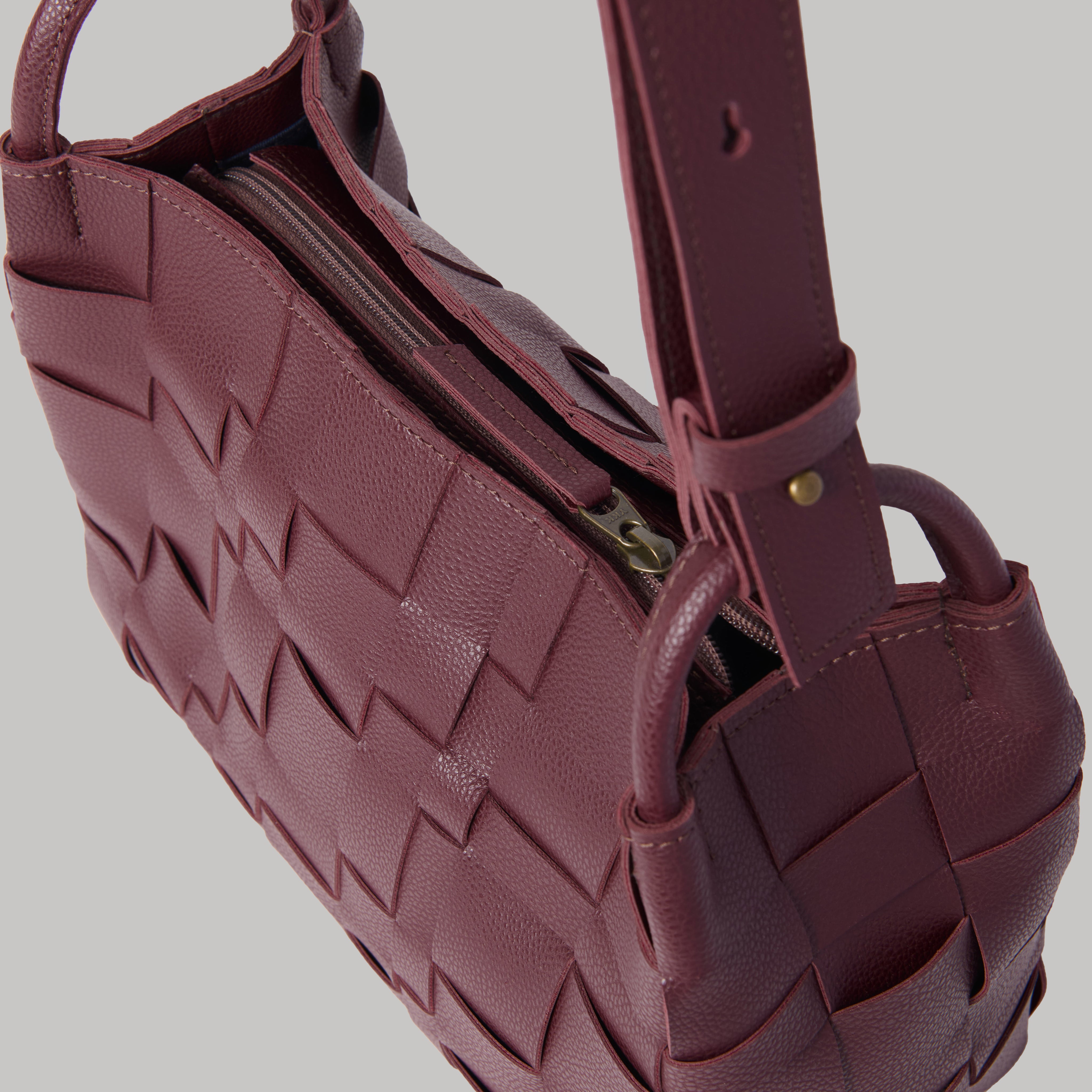Product Details Two Interior Pocket Zip Closure Material: Leatherette Lining: Polyester Comes with a box and dust bag packaging Colour: Mulberry Hardware: Bronze Finish Made in: Malaysia